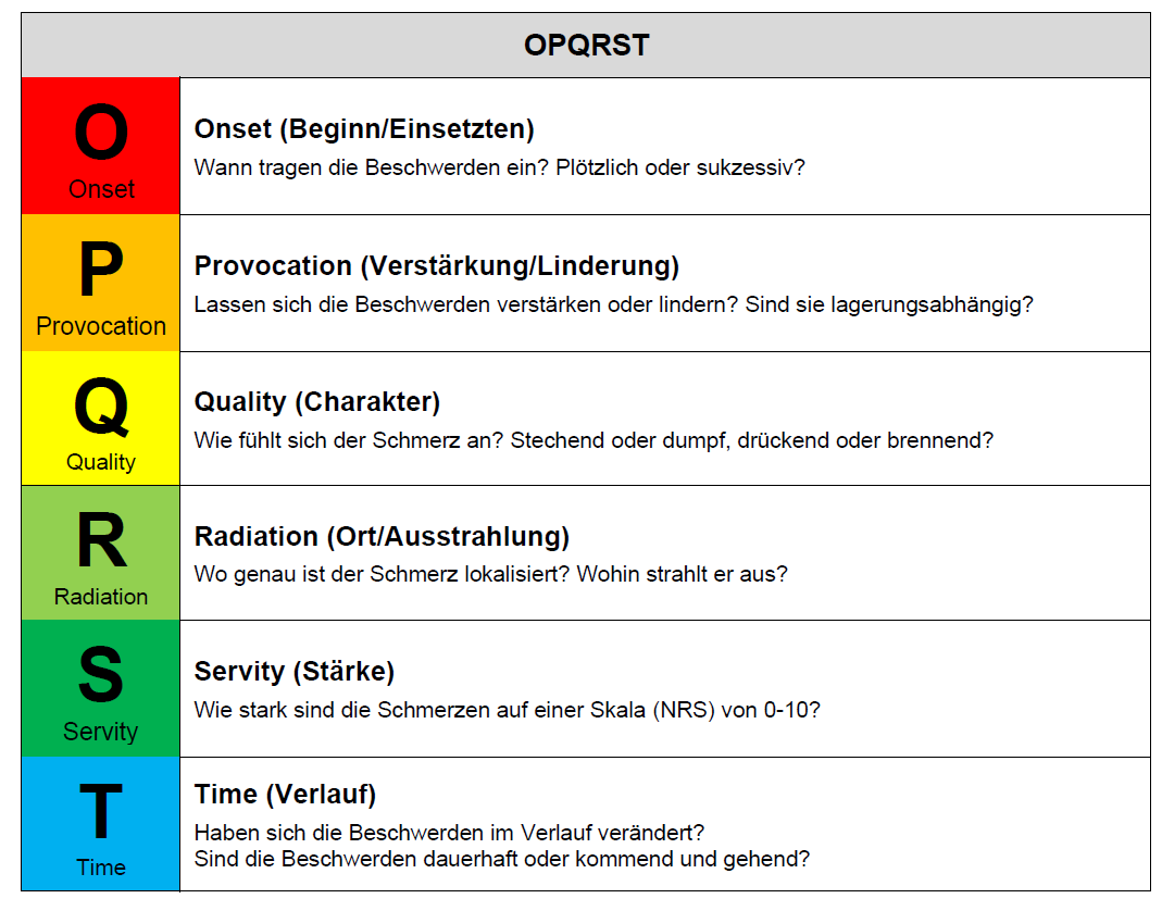 Wenn der Patient beim SAMPLER-Schema unter dem Punkt S = Symptome, Schmerzen äußert wird eine weitere Abfrage nach dem OPQRST-Schema notwendig: