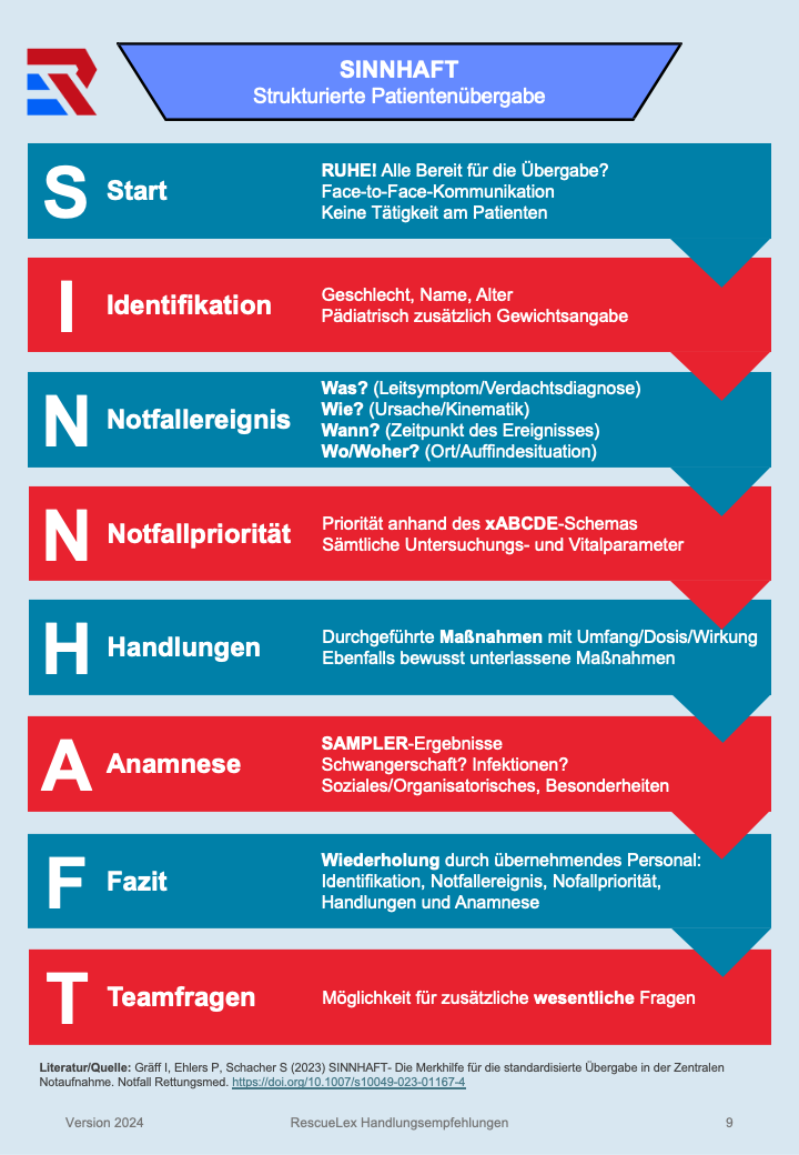 Literatur/Quelle: Gräff I, Ehlers P, Schacher S (2023) SINNHAFT- Die Merkhilfe für die standardisierte Übergabe in der Zentralen Notaufnahme. Notfall Rettungsmed. https://doi.org/10.1007/s10049-023-01167-4